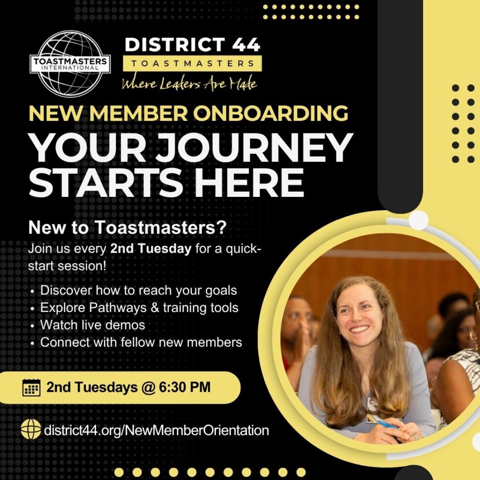 REGISTER | JOIN Welcome to Toastmasters! District 44 New Member Onboarding: Your Journey Starts Here. Just joined a Toastmasters club? We’ve got you...