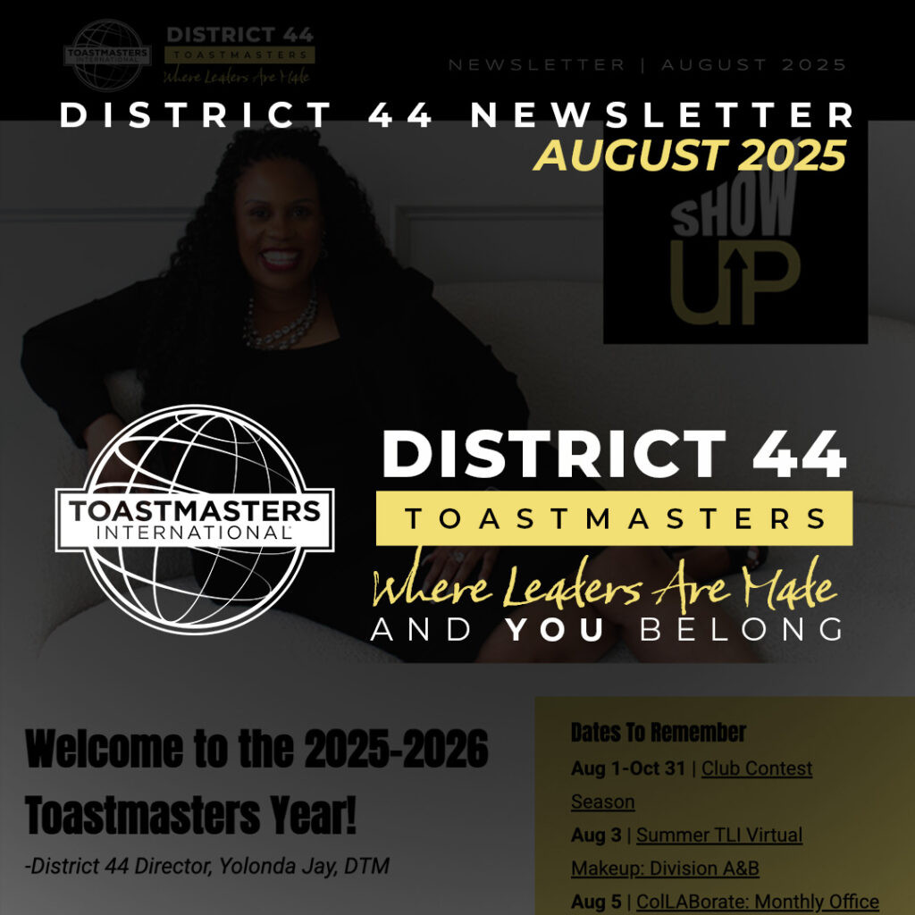 Our District 44 Toastmasters Newsletter is your go-to source for the latest updates, leadership tips, member highlights, training opportunities, and club success stories across Georgia. Whether you’re a new member, a club officer, or a longtime leader, this is your inside look at the momentum driving our district forward.