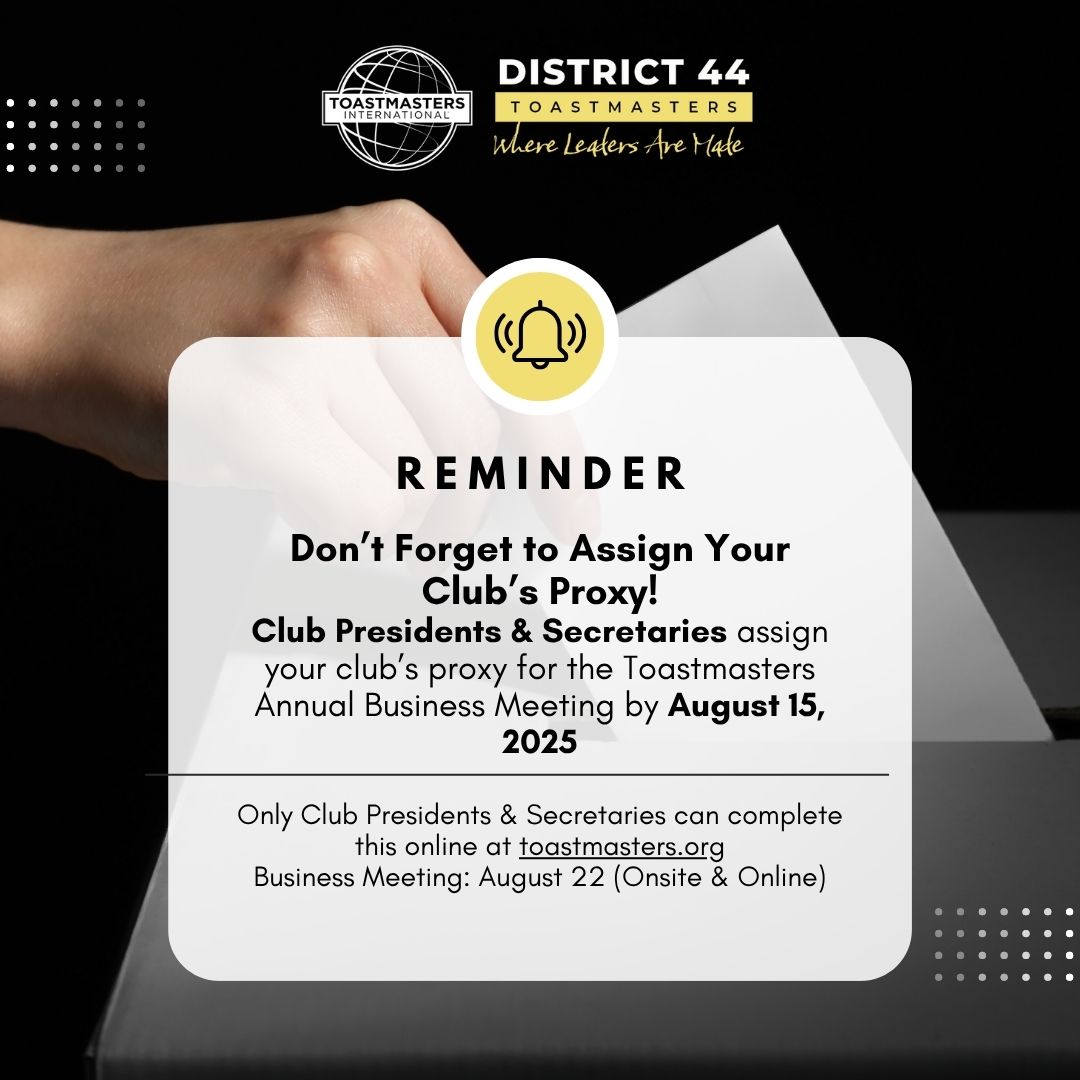 The Toastmasters International Annual Business Meeting is coming up on August 22, 2025, and your club’s vote matters!