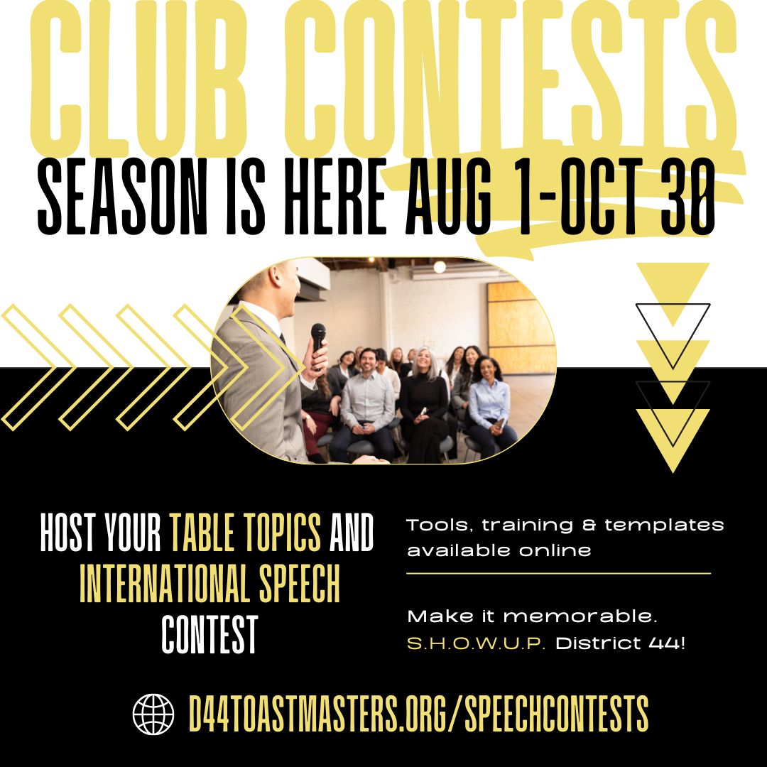 It all begins at the club level! The D44 Contest Season kicks off with International Speech and Table Topics contests hosted by individual clubs. This is your moment to inspire, persuade, or think on your feet.