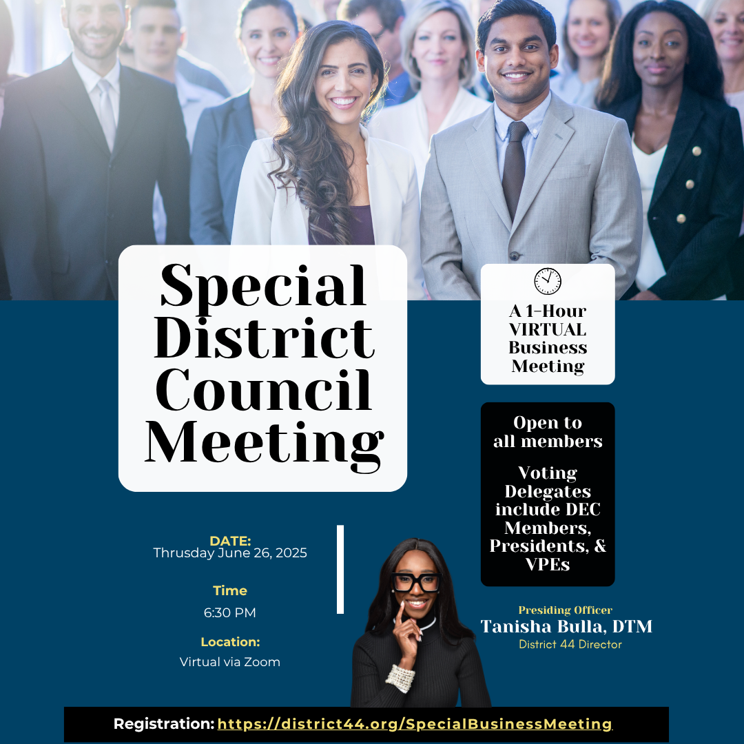 We Need You: This meeting is your opportunity to influence the future of District 44 for the 2025 – 2026 year. Please register immediately, plan to attend, come prepared to participate, and be ready to vote.