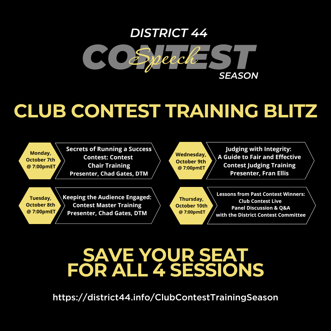 Register Now CLUB CONTEST SEASON IS OFFICIALLY HERE! The District Contest Committee is excited to share a wealth of resources to ensure your club members have an incredible contest experience! Whether it’s your first contest or your tenth, there’s something this season for everyone to learn! Join us for our 5 LIVE virtual training sessions […]