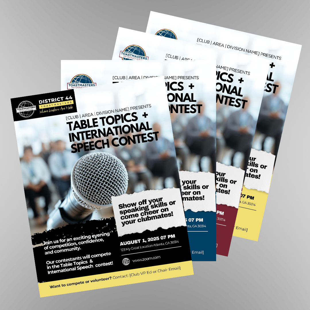 For the 2025–2026 Toastmasters year, District 44 will host Table Topics and International Speech Contests at all levels—Club, Area, Division, and District.